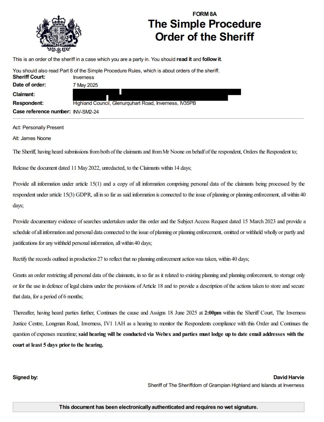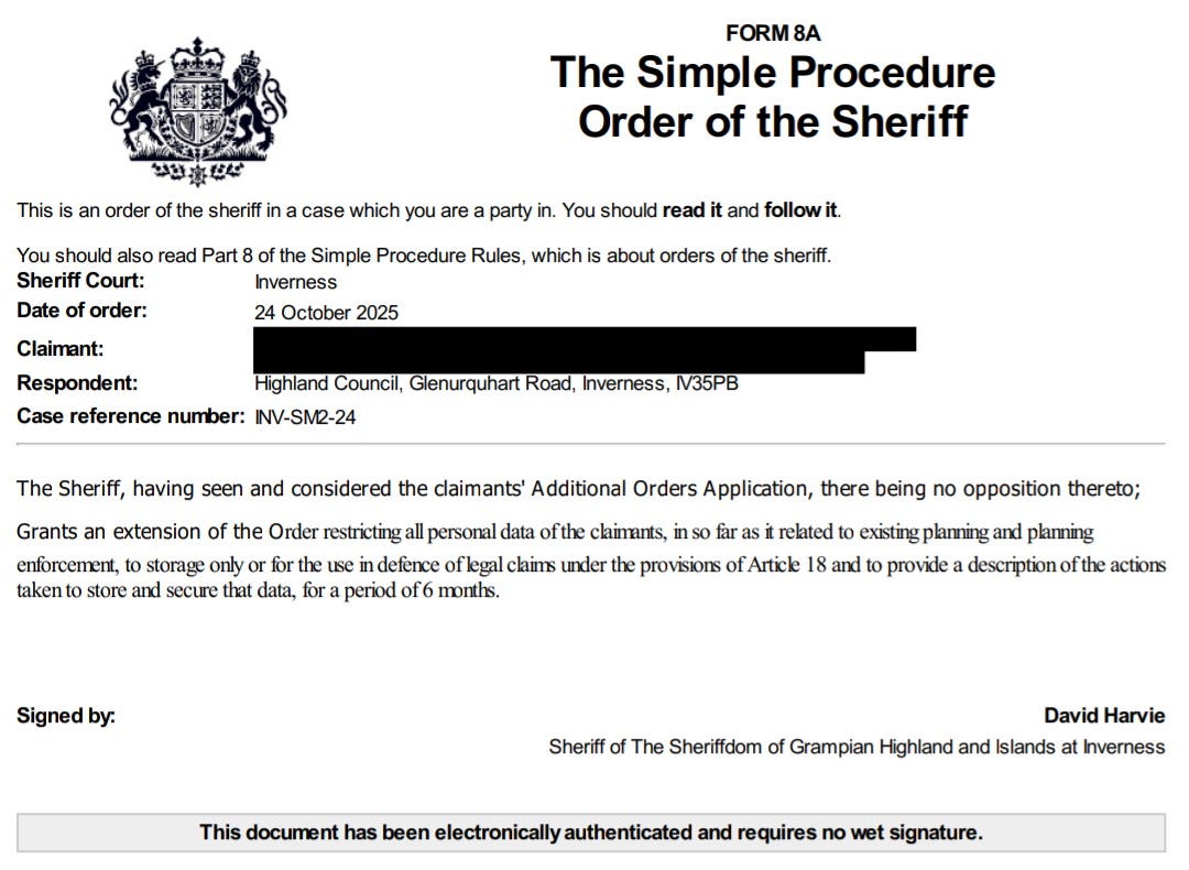 Restriction order. Given the amount of unlawfully obtained & retained data and weaponisation of my data by the Highland Council, the lawfulness of their processing was challenged on numerous occasions throughout this claim. The data controller must discharge the burden to demonstrate the processing was lawful which is a high bar to meet indeed. Under the terms of Article 18 and 21 GDPR, personal data falls to be restricted to storage only &/or for very strict & specific processing operations where that burden is not discharged. Restrictions are most often temporary measures to preserve the position until either the burden is discharged by the controller or the data subject exercises further rights like erasure over the contested data undergoing processing. This meant that to comply with the order, they were required to lock away all the data, remove it from the planning portal and IDOX database with strict access control, including purge data from email inboxes of staff and sequester it with the rest of the stored data. Restricted means.. restricted. No access, no use, no enchilada. Did they fully comply? Not really.. it's complicated but, I've now had to raise a 2nd claim against the Assessor of the Highland & Western Isles Valuation Joint Board as 1st respondent and the Highland Council as a 2nd respondent to that claim, INV-SM11-25.